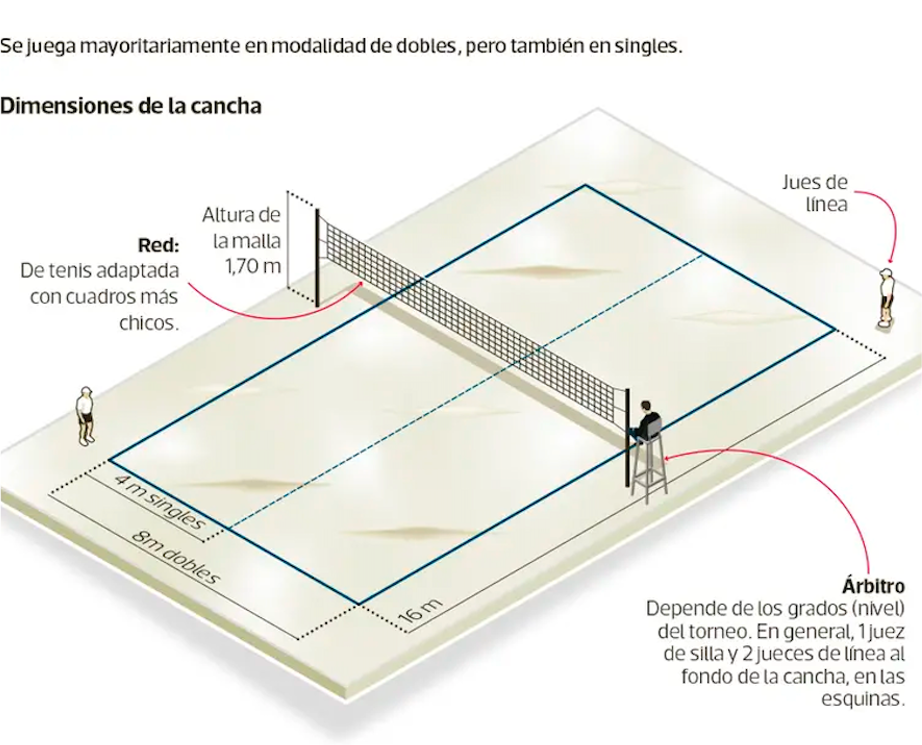 Conoce la cancha: La cancha de Beach Tennis tiene una superficie de 16×8 metros, con una red de 1,70 metros de altura. Asegúrate de conocer las dimensiones de la cancha y la ubicación de la red antes de empezar a jugar.